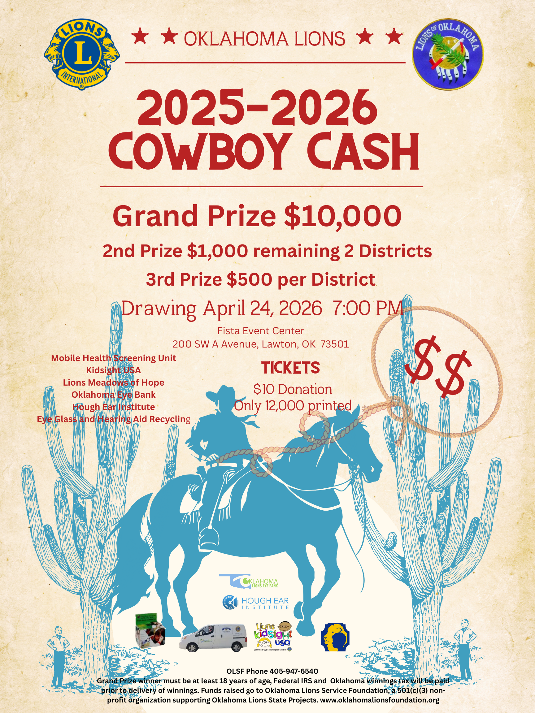 The drawing is held at the Ok Lions State Convention on Friday evening April 24,2025. The Grand Prize winner will receive $10,000 Cash! In addition, the remaining two districts are guaranteed to win a 2nd place prize of $1000.00 Cash. We are also adding additional prizes per district of $500.00 each! So, this is truly a Cowboy Cash Fundraiser!